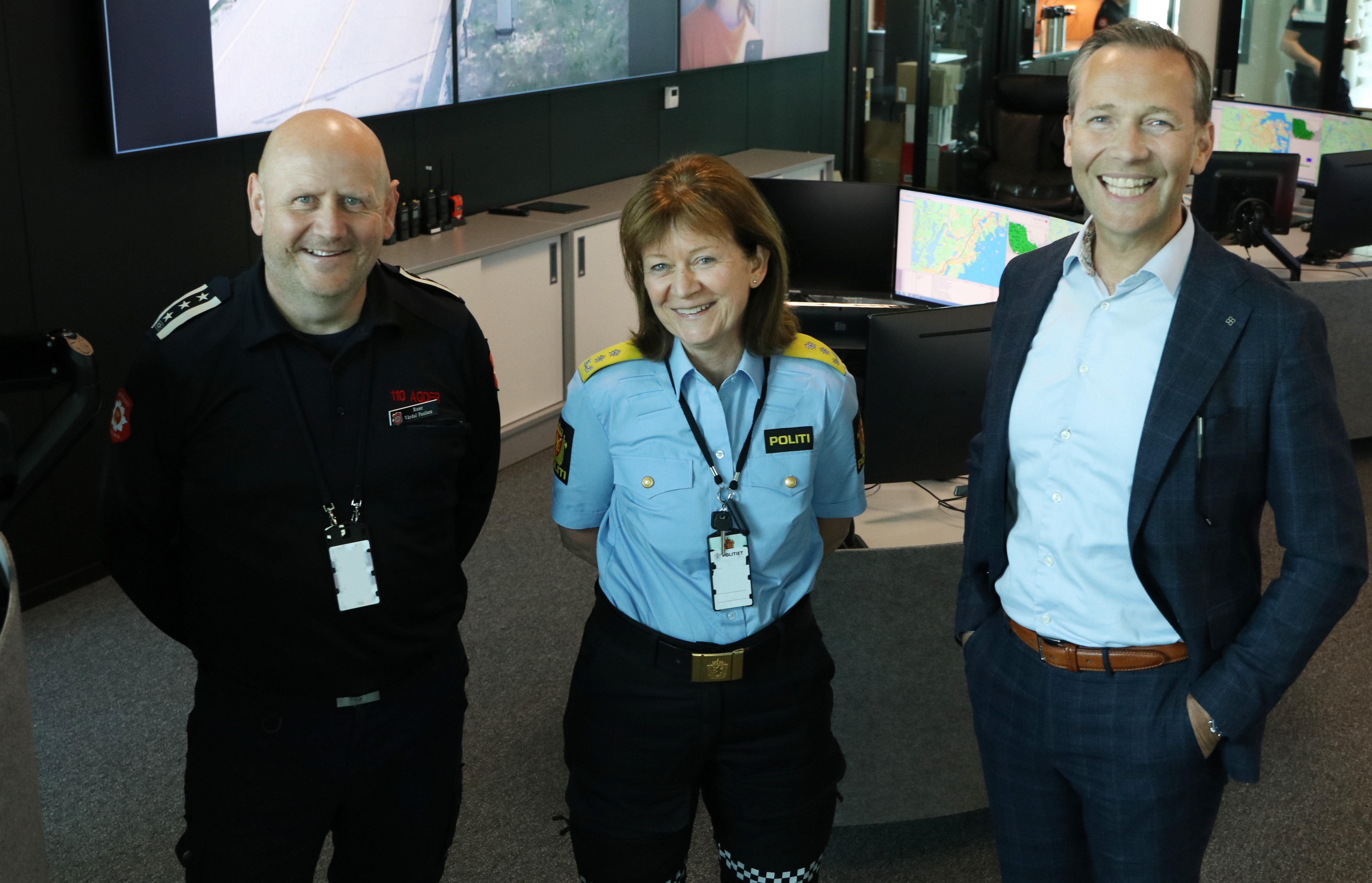 PÅ PLASS: F.v: Rune Vårdal Paulsen, daglig leder 110 Agder IKS, Kjerstin Askholt politimester i Agder politidistrikt og Espen Jarle Hansen, Klinikkdirektør for prehospitale tjenester, herunder AMK, ved Sørlandet sykehus HF. FOTO: Politiet