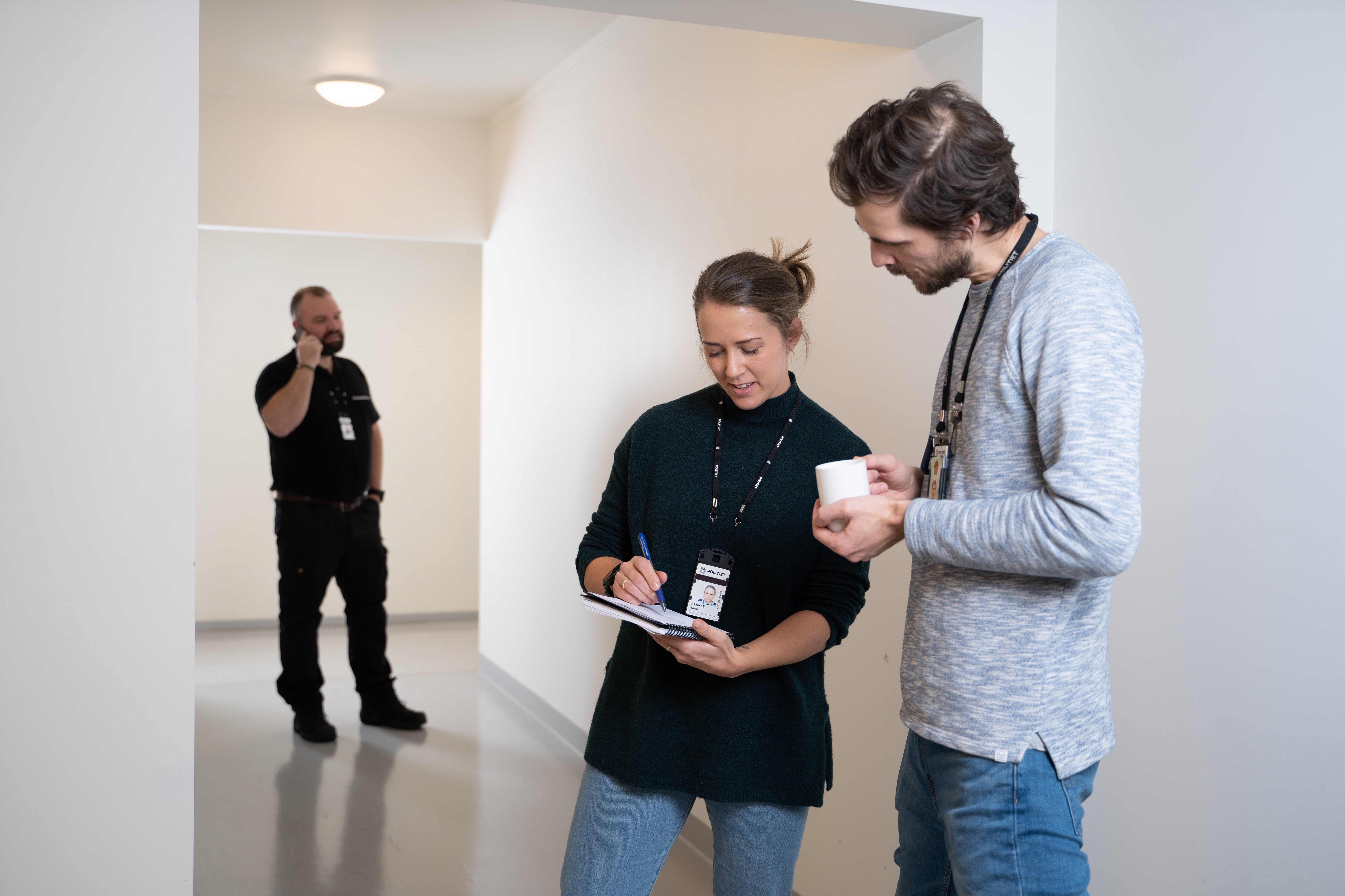 Godt samarbeid: Karin Aarnes Nørstebø synes det givende å være en del av helheten i politiet, som alle er avhengige av hverandre for å løse en sak. Her med kollega Rune Engvik (til venstre) og Karl Martin Sørli.Foto: Politiet