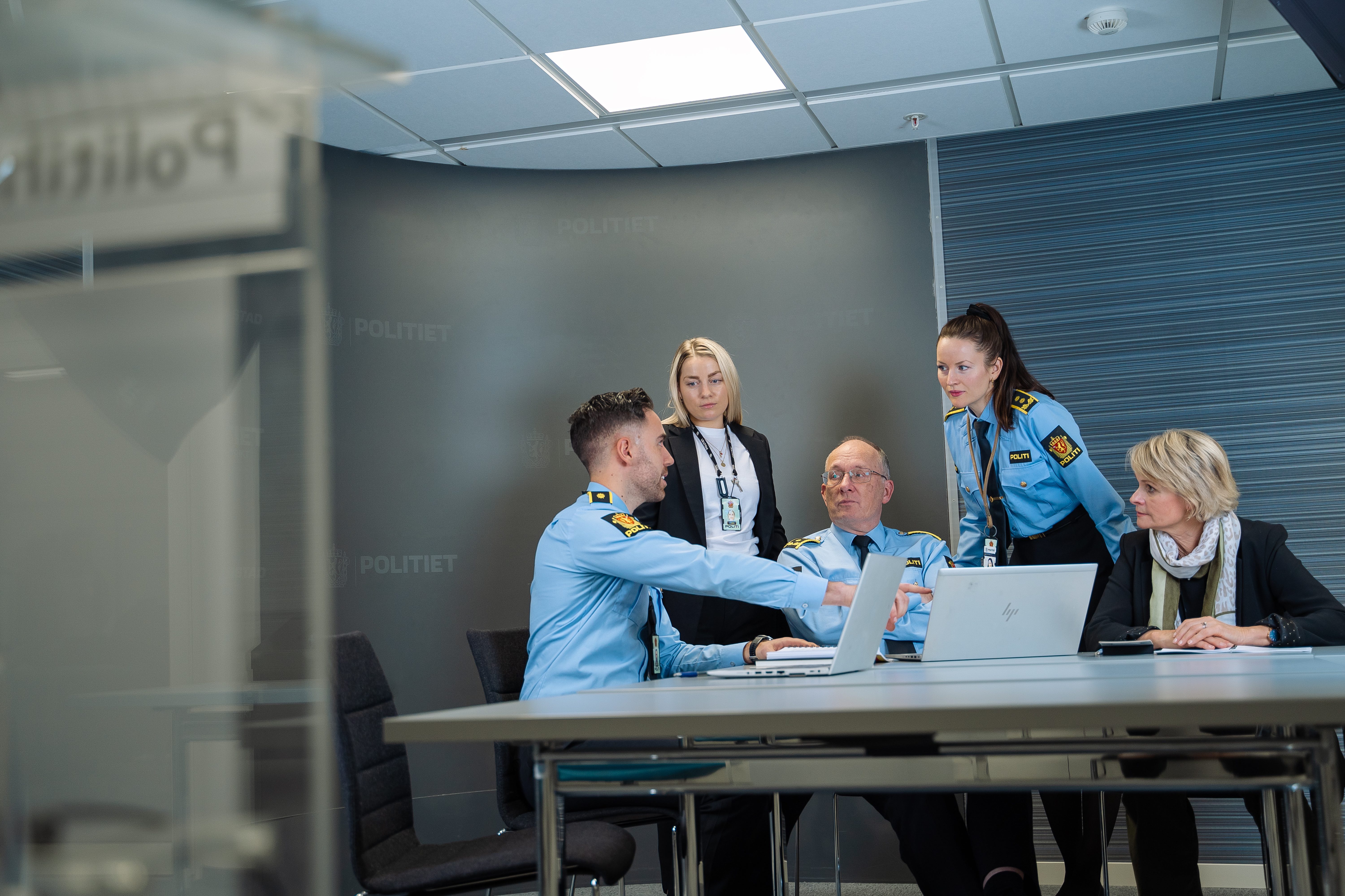 Kollegaer i politiet som snakker sammen på et kontor. Foto.
