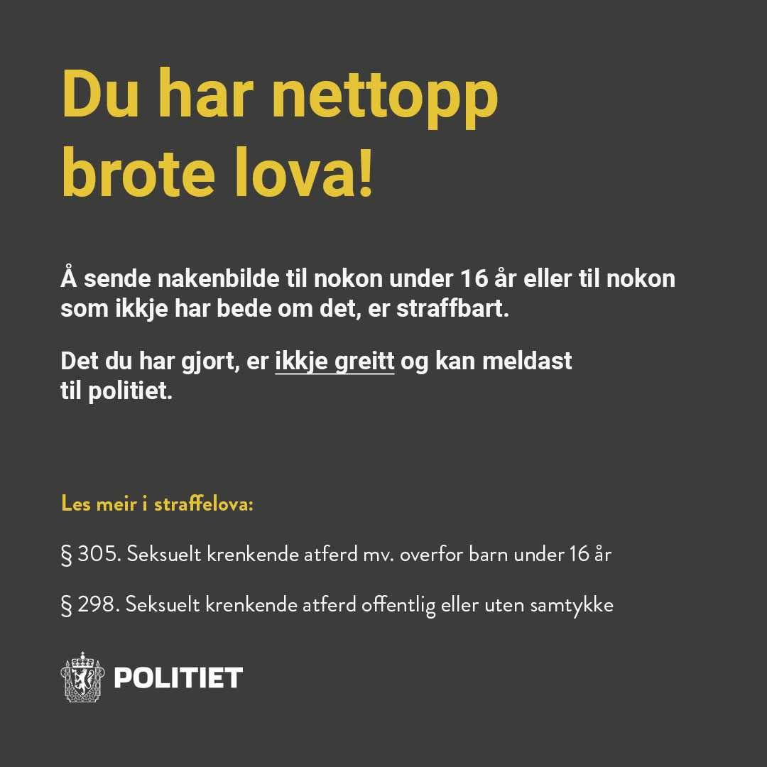 Hvis du får uønskede nakenbilder, så bør du også rapportere den som sender til tjenesten der det skjedde, og du kan melde fra til politiet. Bruk gjerne en av nettpatruljene våre eller tips.politiet.no.